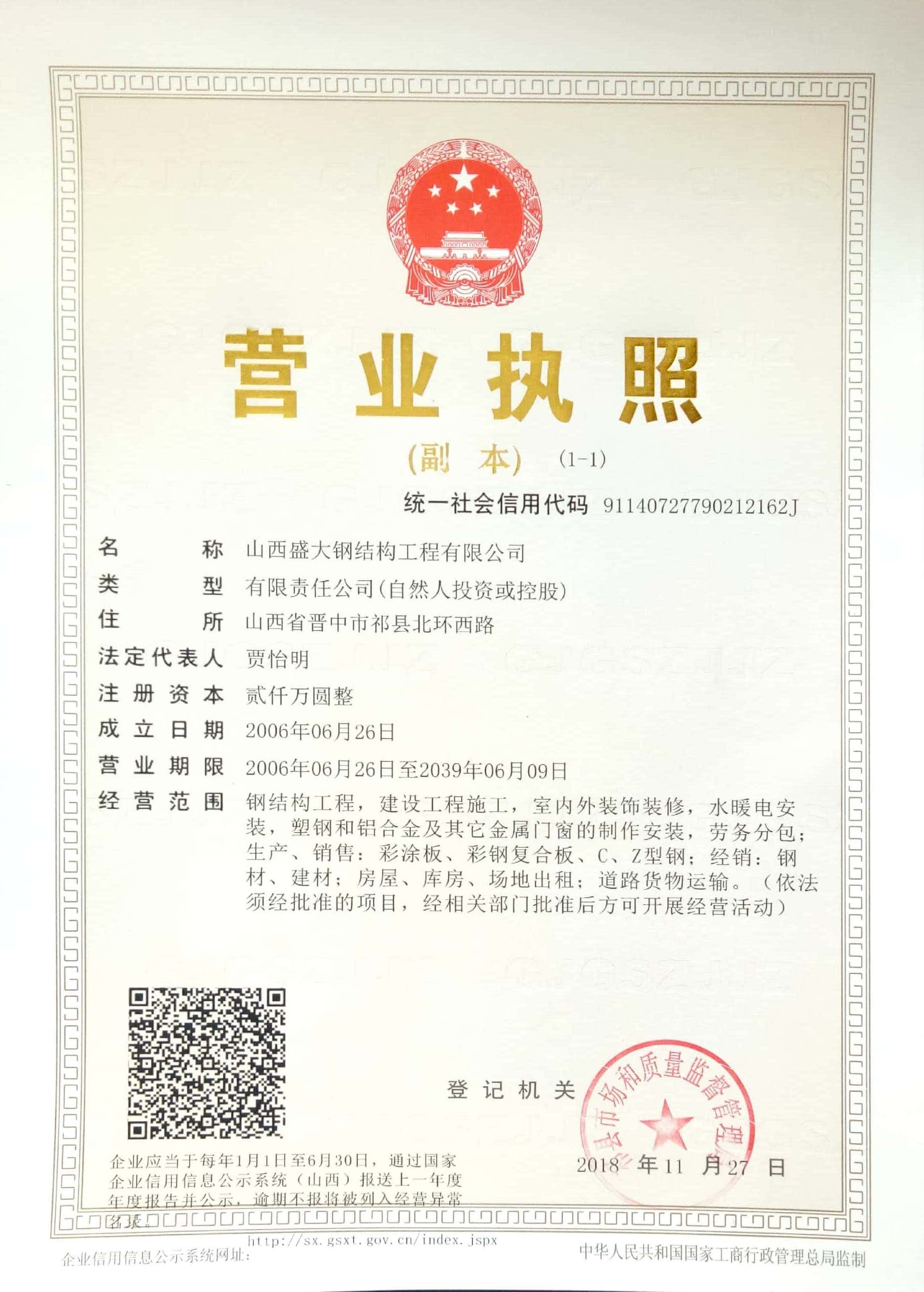 山西盛大鋼結構工程有限公司 山西盛大鋼結構工程有限公司成立于1996年,坐落于國家歷史文化名城——山西祁縣。擁有兩大智能化鋼結構生產基地,占地110畝,建筑面積3萬余平方米,具備鋼結構專業承包貳級、建筑工程施工總承包貳級資質,是一家集設計、制造、施工于一體的大型鋼結構工程企業。 盛大鋼構是中國鋼結構協會會員單位,山西鋼結構協會副會長單位,山西建筑企業商會理事單位,山西省土木建筑學會會員單位,擁有國家知識產權局注冊商標。公司已通過ISO9001質量管理體系認證,體系覆蓋鋼結構加工與施工等核心… more +